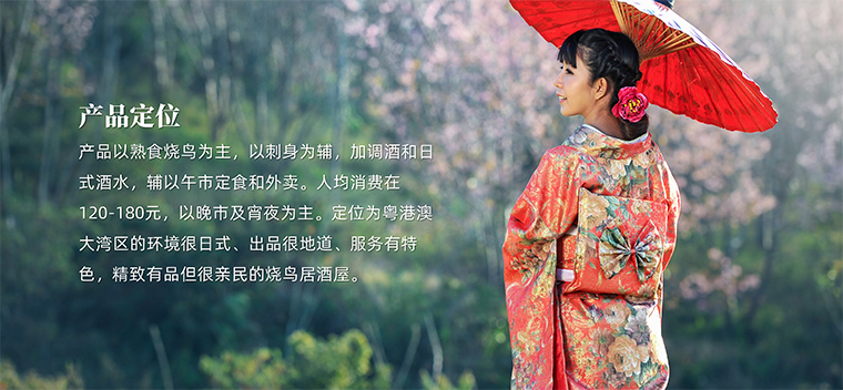 4、我們定位的燒鳥居酒屋:產品以熟食燒鳥為主,以刺身為輔,加調酒和日式酒水,輔以午市定食和外賣。人均消費在120-180元,以晚市及宵夜為主。定位為粵港澳大灣區的環境很日式、出品很地道、服務有特色,精致有品但很親民的燒鳥居酒屋。