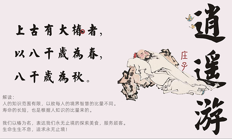 所以品深餐飲全案策劃設計團隊首先提出了玉椿的品牌描述:“上古有大椿者,以八千歲為春,以八千歲為秋。”這句話來自莊子的《逍遙游》,我們將玉椿綁定在中國的文化母體上,這句話是經過幾千年傳頌下來,既表明我們品牌由來,又讓消費者感覺到品牌的歷史悠久。我們直接拿過來用,能量極大,還不需要額外花錢,這是典型的最高明的抄襲。而且這句話不僅在中國被熟知,在日本文化中也是經典,傳頌了千年。當消費者讀完這句話,對我們產生了認知和記憶,玉椿也基本上被記住了。八千年,這個話語足夠大,力量足夠強,還有誰能超過它?這句話很好地將品牌淵源與品牌名稱綁在一起,聚焦品牌核心名“椿”,減少信息干擾,聚焦品牌傳播,讓品牌迅速被人所知曉。