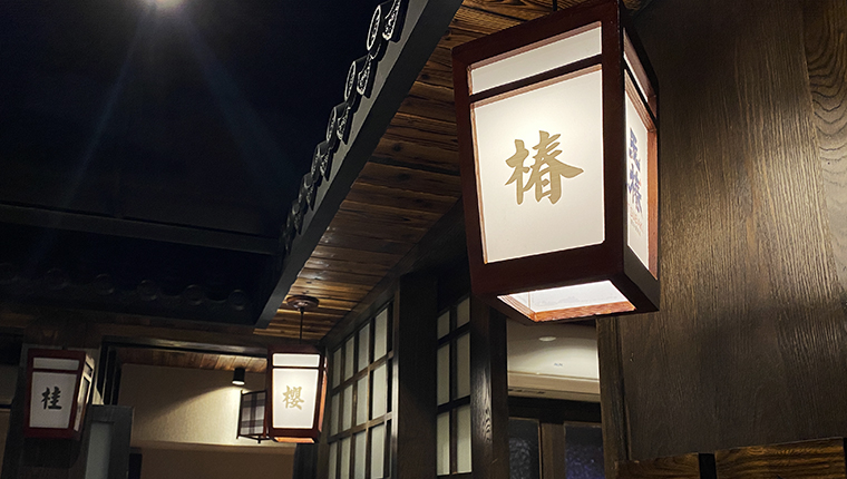 玉椿的門頭,使用京都古建筑的山墻造型,中間裝飾“椿”的家徽,既表達品牌名稱,又有強烈的復古氣質,極具江戶時代特征。