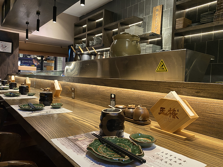 為了營造京都風格的空間感受,品深餐飲為玉椿設計定制的家具采用了實木材質,開放漆做舊工藝處理,呈現出一種江戶時代的歷史滄桑質感;與門店的招牌匾額,儲存柜顏色完全一致,顧客使用時候的歷史體驗感更為強烈