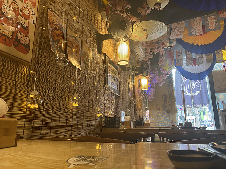 2、一樓大廳及吊頂的設計把京都的古老街道,巷子搬到我們店里。整個大廳的頂部環繞一圈日式黑瓦頂,四周幾個日式玻璃木窗,與地面的青石瓦面,墻體的稻草漆,燒烤吧臺形成一體化的京都風格。置身其中,仿佛漫步于京都的古老美食街道中,熙熙攘攘,熱鬧非凡,抬頭間還能看見二樓的日本侍女正在推開窗戶,朝著樓下觀望。