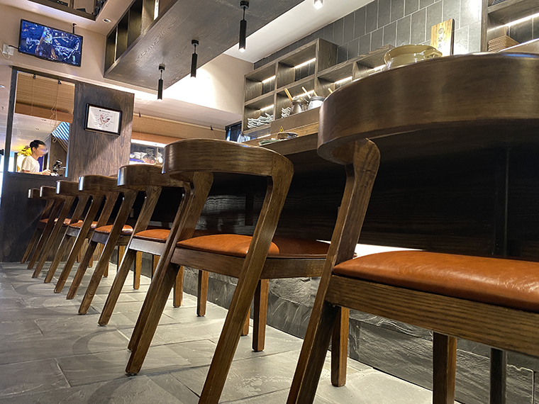 最能體現居酒屋熱鬧感的是大廳,最能感受燒鳥店煙火氣的是燒烤臺前的長吧臺。當我們坐在燒鳥長吧臺前,看著燒鳥師傅熟練地穿串,精準地控制火候,不時地翻動烤串,美味現場呈現,匠傳玉椿的理念就鮮明直觀地傳達出來了。所以,整個大廳都是圍繞著燒烤吧臺這一焦點而展開的,全部為單人椅及兩人座位,位置靈活組合,利用率非常高。