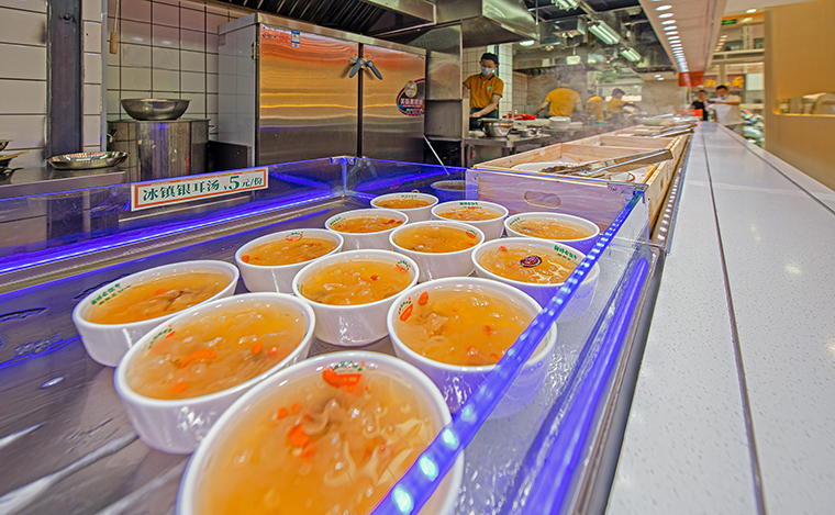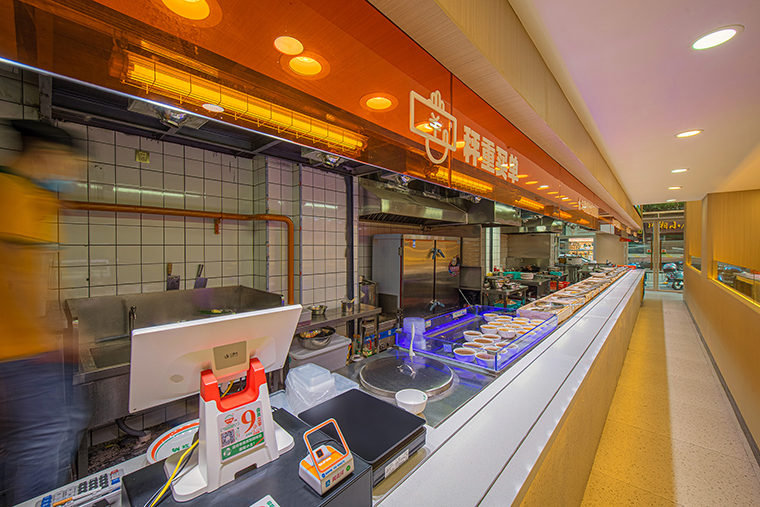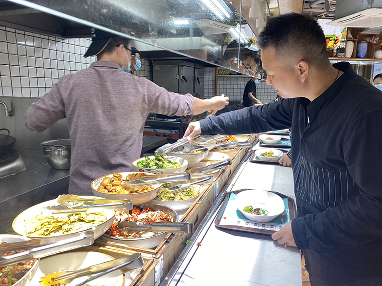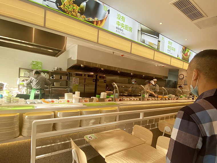 顧客進(jìn)門(mén)洗手,取餐盤(pán)自助選菜,找位置就餐,餐具回收,整個(gè)動(dòng)線清晰流暢,運(yùn)作一氣呵成。選菜臺(tái)的設(shè)計(jì)非常驚艷,30多到菜品排列成一行,在燈光照射,非常有吸引力。讓消費(fèi)者產(chǎn)生一種想全部吃一遍的沖動(dòng),進(jìn)而胃口大開(kāi),長(zhǎng)期光顧我們。