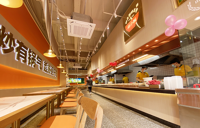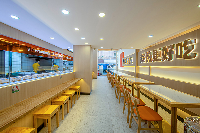 門(mén)口大面積落地玻璃、墻面使用板材、白色大理石打菜臺(tái)、灰色地面、木色桌面,橙色亞克力板。整個(gè)空間追求明亮、整潔、舒適的視覺(jué)感受。尤其是門(mén)口的落地玻璃,窗明幾凈,讓路過(guò)的消費(fèi)者都能看見(jiàn)店內(nèi)熱火朝天的狀態(tài),鍋氣繚繞的煙火氣,產(chǎn)生強(qiáng)烈的進(jìn)店沖動(dòng)。