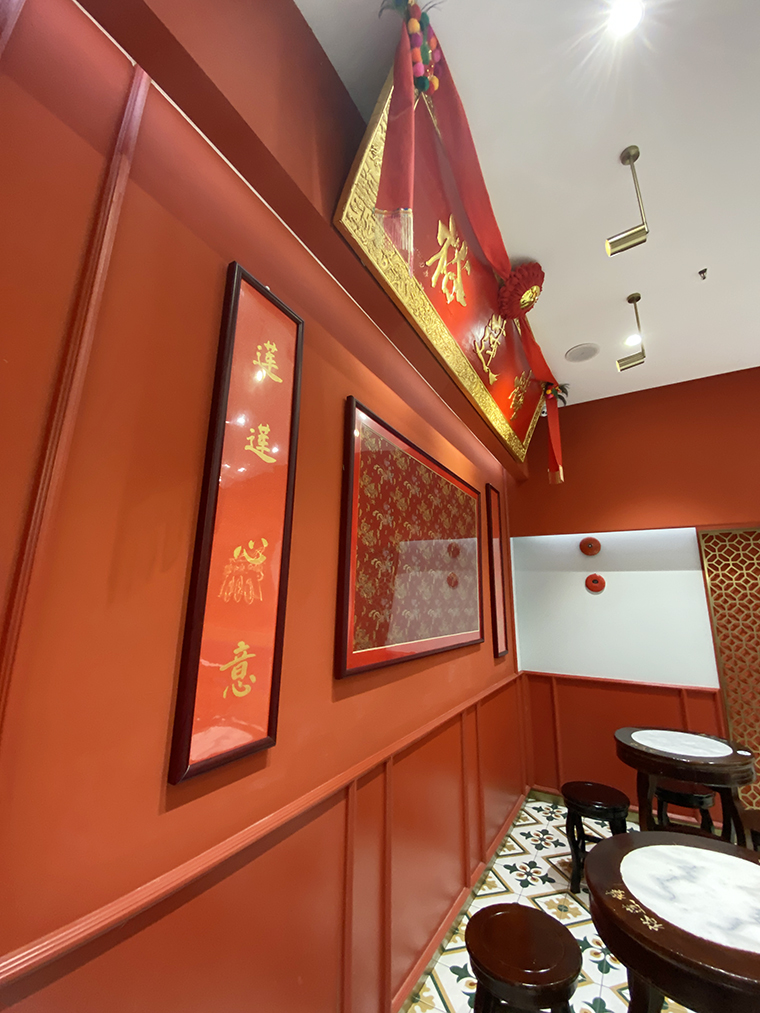 我們通過對(duì)香港本土糖水店,上海當(dāng)?shù)靥撬箱佭M(jìn)行詳細(xì)的調(diào)研,并結(jié)合當(dāng)下流行趨勢。我們發(fā)現(xiàn),喝糖水最多的都是女性顧客,糖水有養(yǎng)顏駐顏的功效。我們提取了當(dāng)下最流行的“故宮紅”,將主題定位為“來自故宮的視覺盛宴”,整個(gè)門店大面積紅色和金色搭配,配色熱情而有貴氣。