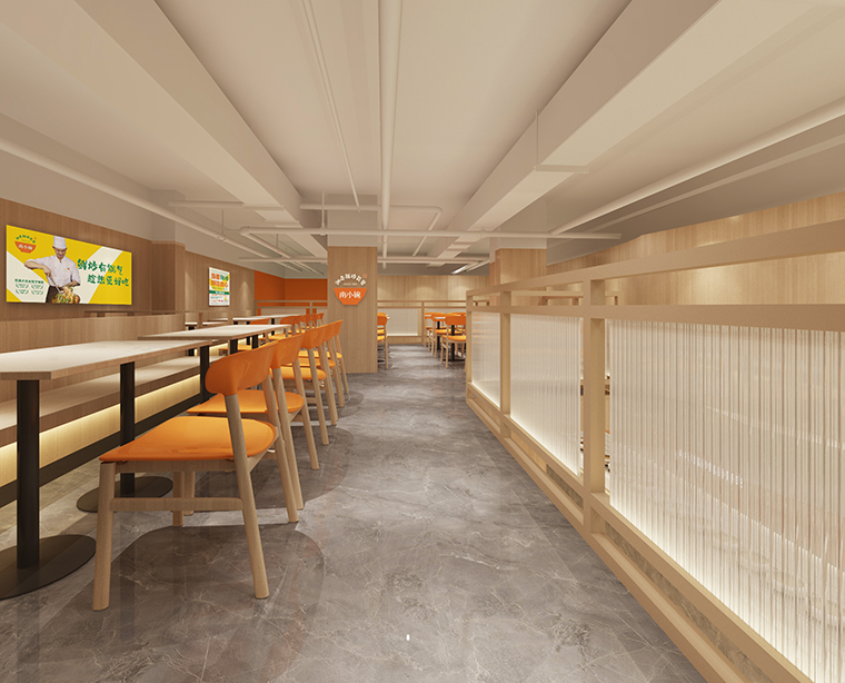 3、內(nèi)部使用大面積的橙色體現(xiàn)鮮炒有鍋氣的特點(diǎn),橙色既使人產(chǎn)生一種陽(yáng)光熱情的心里感受,又是現(xiàn)炒時(shí)火焰的顏色,體現(xiàn)了現(xiàn)炒的特性,識(shí)別度非常高。整面墻的木色板材,木色有自己獨(dú)特的質(zhì)感、在空間中又更有親和力,在狹窄的簡(jiǎn)餐空間中也會(huì)讓人感受到輕松,給人一種可釋懷的愉悅,讓人隨時(shí)隨地都能感受到大自然的生機(jī)。