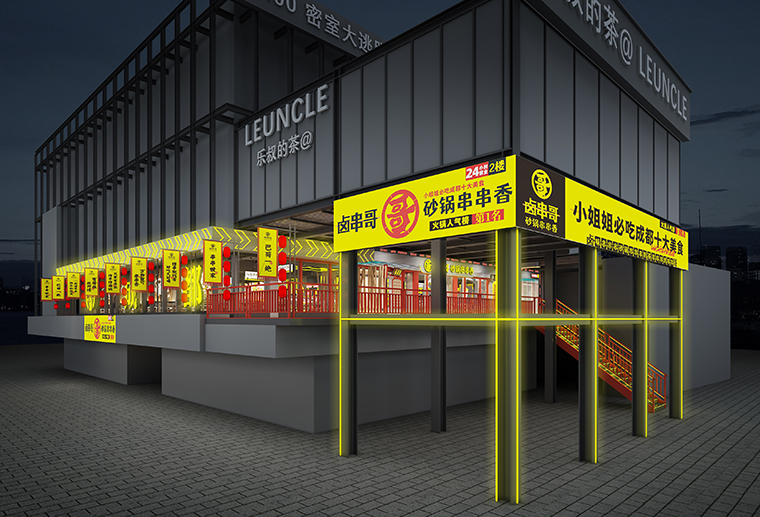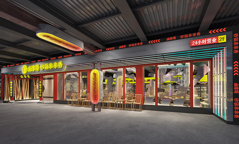 1、鹵串哥砂鍋串串香首次進(jìn)入深圳市場(chǎng),如何通過空間裝飾裝修設(shè)計(jì)的用餐體驗(yàn)環(huán)境來表現(xiàn)串串香火鍋與其他火鍋、其他餐飲品類不同的市井氣,煙火氣?