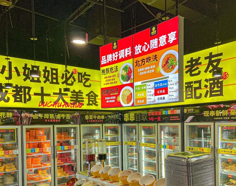 4、空間門店中最醒目的就是取串串的一長(zhǎng)溜冷鮮柜,甲方團(tuán)隊(duì)希望多用廣告畫面展示菜品賣點(diǎn),各種酒水飲料等。我們則認(rèn)為放菜品畫面太小,傳播力很弱,圖片也分散,關(guān)注度更低。我們直接用一句話語來傳達(dá):小姐姐必吃成都十大美食。既討巧了我們的主流客群,也用成都這一大IP來背書。很特別,很震撼,效果當(dāng)然更好。其他需要傳達(dá)的信息如產(chǎn)品價(jià)格、產(chǎn)品核心賣點(diǎn),我們都用背膠貼的形式,貼在冷鮮柜門上,廣告效應(yīng)顯著。