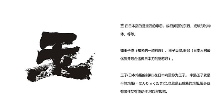 玉”在日本指的是寶石的意思,或很美麗的東西,或球形的物體等等。如玉子(日本雞蛋的別稱),半熟玉子就是半熟雞蛋(はんじゅくたまご),也就是五成熟的雞蛋,蛋身既有彈性又有流動性,可以拌飯吃。玉子燒(知名的一道料理),玉子豆腐,玉鋼(日本人對最優(yōu)質(zhì)并最合適做日本刀的鋼的美稱)。
